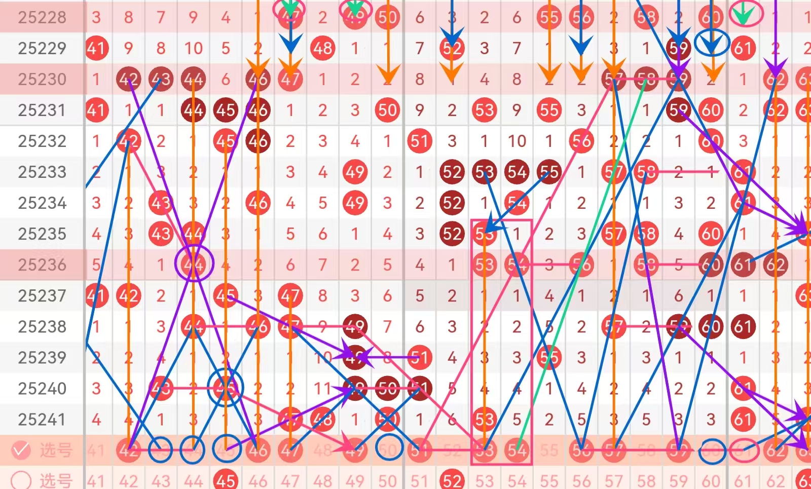 三区间上期出了4个号码球,温态开出;42 46阶梯码,二择一推荐42这个遗漏上下对称号码球,42 46大交叉斜连, 本期这里可42 46双码同拿主防;43 44 45小防即可;47 48连号下面,选择47看重上下对称的三横连转三斜连形态,主做分边46,那么这里的46 47是本期的不错连号复式防守码;45 与梅花码49交叉斜连,本区间的梅花码还是经常开出,所本期的49梅花码可主做,49 51交叉斜连,51也是点位形态码,这里49 51可同做,那么三区4字头的46 47 49 51奇连带小连的形态可主防;51 53带斜连的阶梯码,53走重上下对称点位,形态复制码,本期53可看重主做,带上旁边的54可连号做防;56 57 59是5字头中部回补点位,这里可三择一或三择二拿号主做,57 59是首选;尾部60小防即可;