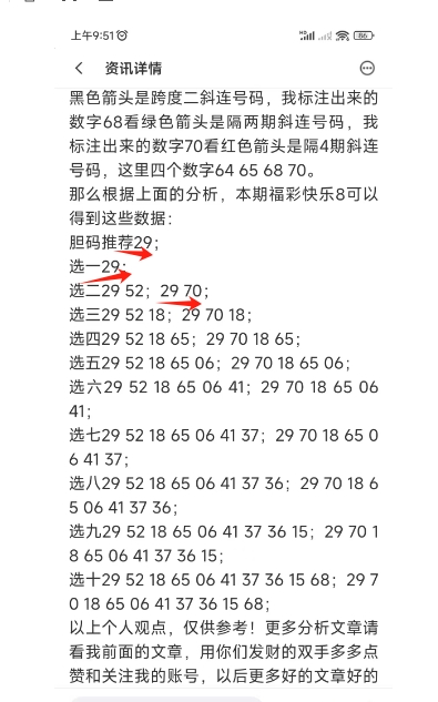 上图是福彩快乐8上期号码分析文章截图,我最后推荐胆码,选一,选二正确,这个你们去看上期的号码分析文章吧。
