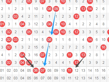 上图是福彩快乐8开奖号码走势分布图,我标志出来的数字06 11看黑色箭头都是斜连号码,我标志出来的数字07看蓝色箭头是隔3期的斜连号码,这里三个数字06 07 11。