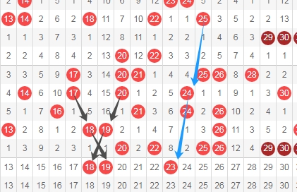 上图是福彩快乐8开奖号码走势分布图,我标志出来的数字18 19看黑色箭头是斜连号码,我标志出来的数字23看蓝色箭头是隔三期的斜连号码,这里三个数字18 19 23。