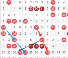上图是福彩快乐8开奖号码走势分布图,我标志出来的数字27看黑色箭头跨度二斜连号码,我标志出来的数字28看蓝色箭头跨度二隔一期斜连号码,我标志出来的数字32看红色箭头是隔一期斜连号码,这里三个数字27 28 32。