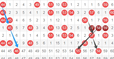 上图是福彩快乐8开奖号码走势分布图,我标志出来的数字46看蓝色箭头是隔两期斜连号码,我标志出来的数字55看黑色箭头是斜连号码,我标志出来的数字58看黑色箭头是隔一期斜连号码,这里三个数字46 55 58。