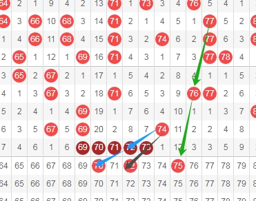 上图是福彩快乐8开奖号码走势分布图,我标志出来的数字70看蓝色箭头是跨度二斜连号码,我标志出来的数字72看黑色箭头是斜连号码,我标志出来的数字75看绿色箭头是隔三期斜连号码,这里三个数字70 72 75。