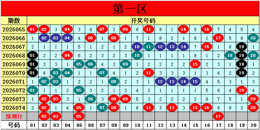 目前第一区包含14个热码:重码9个02、05、07、08、11、13、15、16、20,邻码5个01、03、06、09、19,孤码0个;包含5个温码:邻码4个04、10、12、14,孤码1个18;包含1个冷码:邻码1个17,孤码0个;号码冷温热个数比为1:5:14,重号、邻码、孤码个数比为9:10:1。