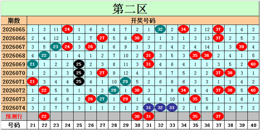 目前第二区包含14个热码:重码3个31、32、33,邻码3个30、34、40,孤码8个22、26、27、28、29、35、37、38;包含3个温码:邻码1个21,孤码2个25、36;包含3个冷码:邻码0个,孤码3个23、24、39;号码冷温热个数比为3:3:14,重号、邻码、孤码个数比为3:4:13。