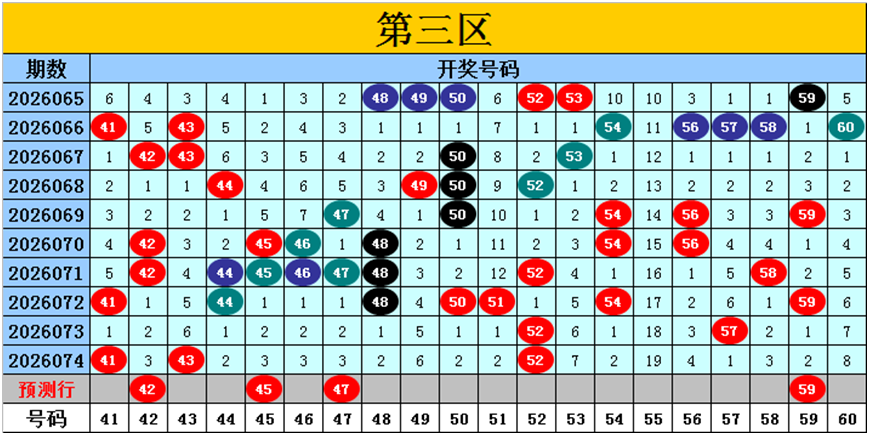 目前第三区包含10个热码:重码3个41、43、52,邻码2个44、51,孤码5个48、50、54、57、59;包含7个温码:邻码1个42,孤码6个45、46、47、49、56、58;包含3个冷码:邻码1个53,孤码2个55、60;号码冷温热个数比为3:7:10,重号、邻码、孤码个数比为3:4:13。