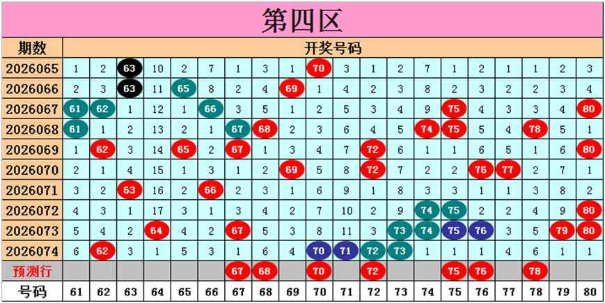 目前第四区包含12个热码:重码5个62、70、71、72、73,邻码1个74,孤码6个64、67、75、76、79、80;包含8个温码:邻码3个61、63、69,孤码5个65、66、68、77、78;包含0个冷码;号码冷温热个数比为0:8:12,重号、邻码、孤码个数比为5:4:11。