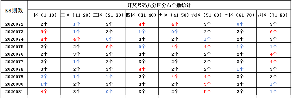 首先看上期回顾,“快乐8”第26081期开奖结果:1.2.8.9.11.12.20.32.34.39.42.43.53.54.55.58.59.63.66.77通过分析开奖号码,分享第一个数据分析:统计开奖号码的八分区冷热走势,判断出号规律。以近10期开奖号码的八分区统计数据为例: