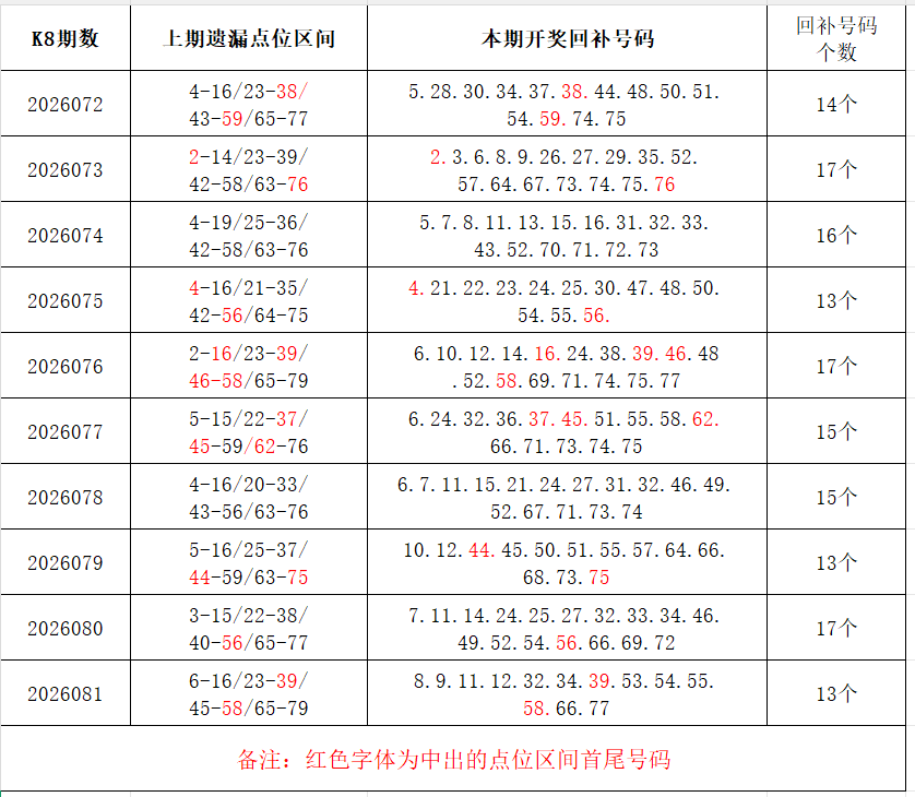 如图,上期的遗漏号码在下期开出10个左右,即为回补号码。定准点位区间首尾号码是关键!以上期2026081期为例,定位4个遗漏区间,围中13码!结合上期开奖号码,以跨度值大于或等于7为依据,本期关注4个遗漏区间:12-20/20-32/43-53/66-77;重点关注遗漏区间:3-16/21-35/45-59/66-78。点位区间号码和大底号码请勿混淆,个人分析,仅供参考。