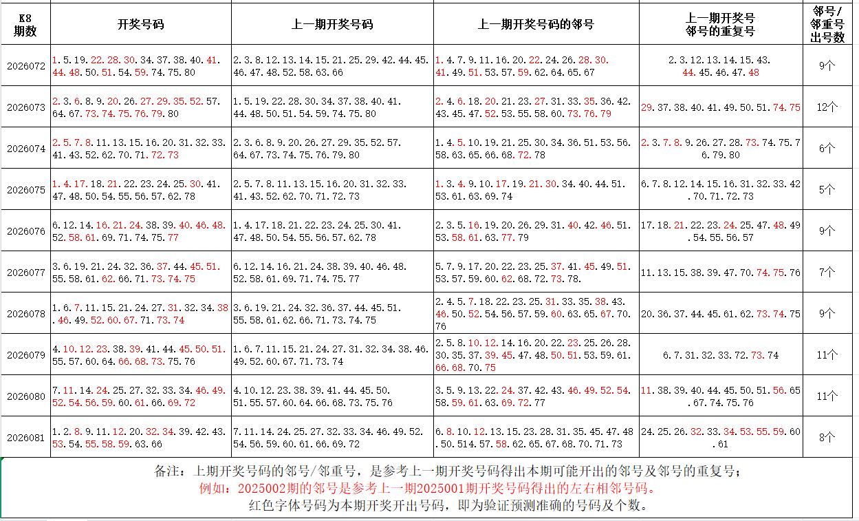 如图,红色字体是上期邻号、邻重号在下期开出,每期开出10个左右。上期邻号开出3个,邻重号开出5个本期参考邻号:3.7.13.19.21.31.35.38.40.41.45.52.56.57.60.62.63.65.67.76.78邻重号:1.2.8.9.10.11.12.42.43.53.54.55.58.59;个人分析,仅供参考。