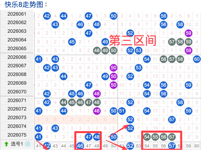 三区间开出了8个奖号(41.47.48.50.54.55.56.57)上期回顾三区开出8个奖号上期的三区间的奖号数量呈现一个递增的形态,4头开出3个号码,本期先来看号码42期出现频率相对来说是很稳定。偶尔有时间隔期数也是很长,但是在近期的开奖中较,号码46在近 30 期内出现次数相对较稳定的号码,近期的活跃度也是较温热。号码52有一定的间歇性,通常间隔5-3期会出现一次,有明显的连续出现态势,走势相对还是很稳定,在整个第三区间的表现较热本期还是可以防守的。号码57走势相对近期较,近期有连续间隔落号的情况,活跃度近期处于状态注意防守。