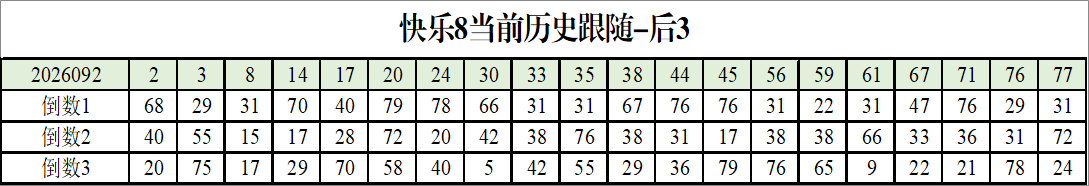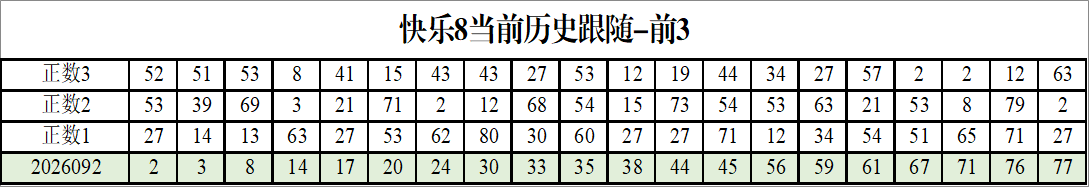 我感觉选热的同时,还要注意防冷条件开出,可以直接选取每个号码跟随出次前三的号码,也可以考虑把出次最后的三个数字加进去,不过这样可能号码太多,可以尝试。图上也能看出单独号码跟随的情况,我就不一一统计每个号码的出次了,我这里考虑提高概率,取每个号码历史跟随的前三号码和后三号码,根据2026092期的号码,我关注正数3和倒数3的号码号码为: