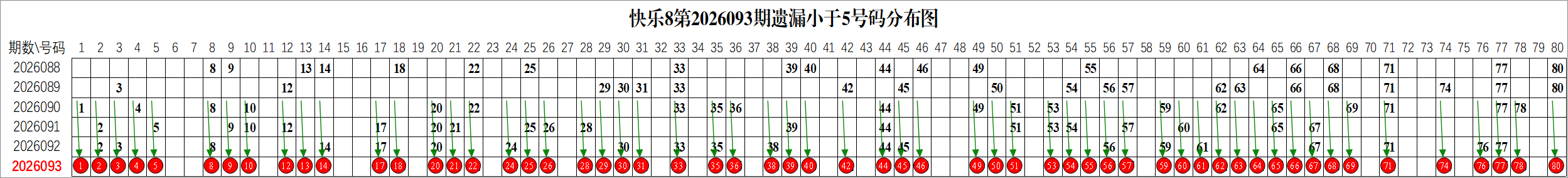 所以这个条件值得关注,从号码分布图上我们可以分析出,遗漏小于5期的号码有: