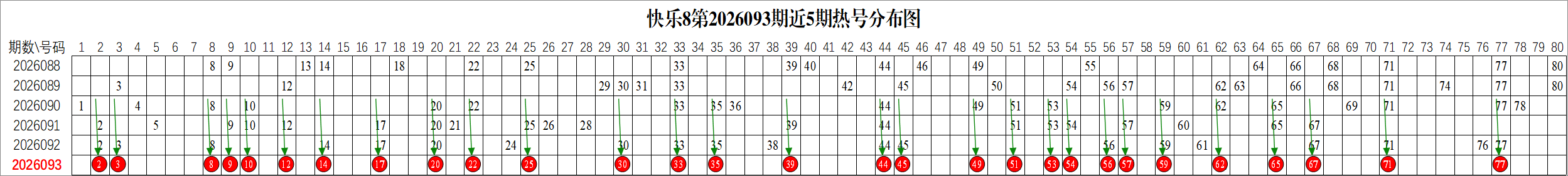 这个条件可以理解为追热号,主要是选取遗漏小于5期的号码来做大底,通过号码分布图我们也能看出,每期都有重复号,都有上期号码的相邻号,再仔细观察下面的部分分布图,2026092期,按照【号码(遗漏)】的方式统计出来是:2(0),3(2),8(1),14(3),17(0),20(0),24(4),........。可以看出遗漏小于5的号码比较常见,这就是一个大概率事件,我们就可以用这个梳理出一部分号码,用来作为我们交集的一组号码。