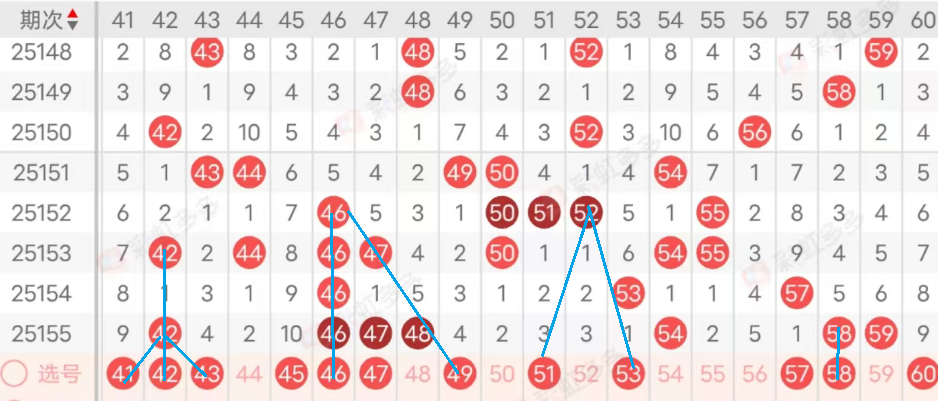 第三区间的走势分析:第三区间上期开出了七个号码球!主要的落号点位在前半区后半区的凤尾处。根据三区间的走势规律!今天的三区间我们第一先关注42这个点位的落号!主看42走重并可能拉下分边码,46 47 48 这个点位主看46继续上楼!以及他的分边码45 49 50.第二后半区首先关注54这个点位的落号!主看它走重并拉下分边码51 52 53 55 。第三58 59 这个点位防守有一码走重!然后关注它们的分边码56 57 60。