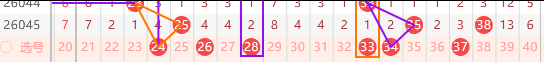 该区间落码数走出冷态,三码下落布局构建整体组合布局;本期可关注该区间4-6码下落回补;那么区域横连点位上可关注一码回补落位;且该区间遗漏四期号码分布偏多,那么24 26 27 30 31 这几个点位上我们可以考虑二至三码下落回补。走势选择上偏向同和值点位落位回补,例如24 33这种组合性质,都有回补的可能性;温态码在该区间有21 29 40这三码也可考虑一码回补,按这样构建,那么该区间在号码选择上还是比较好做布局点;