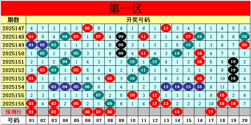 第一区【01-20】分析:上期该区明显较热出现了8个奖号:01、03、05、08、12、13、18、19,奖号冷温热比为0:0:8,邻码和孤码分别出现3个,重码出现2个。