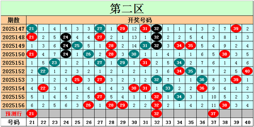 目前第二区包含12个热码:重码5个26、28、29、32、38,邻码4个27、30、31、33,孤码3个22、34、36;包含7个温码:邻码2个25、39,孤码5个21、23、24、35、40;包含1个冷码:邻码1个37,孤码0个;号码冷温热个数比为1:7:12,重号、邻码、孤码个数比为5:7:8。