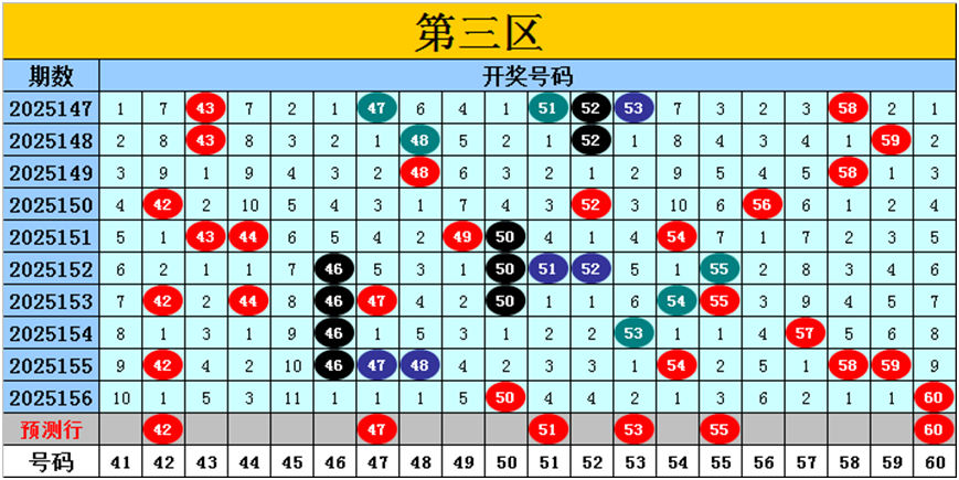 目前第三区包含11个热码:重码2个50、60,邻码1个59,孤码8个42、46、47、48、53、54、57、58;包含7个温码:邻码2个49、51,孤码5个43、44、52、55、56;包含2个冷码:邻码0个,孤码2个41、45;号码冷温热个数比为2:7:11,重号、邻码、孤码个数比为2:3:15。