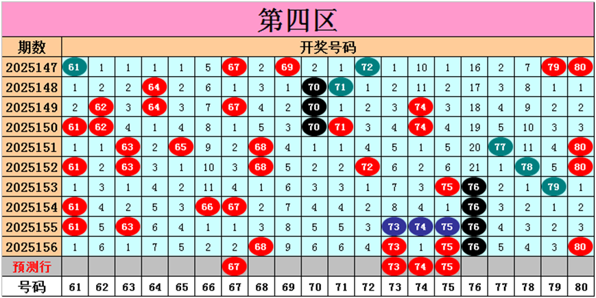 目前第四区包含10个热码:重码5个68、73、75、76、80,邻码3个61、67、74,孤码2个63、66;包含8个温码:邻码3个72、77、79,孤码5个62、65、70、71、78;包含2个冷码:邻码1个69,孤码1个64;号码冷温热个数比为2:8:10,重号、邻码、孤码个数比为5:7:8。