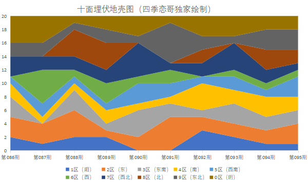 上图根据每期出号数量绘制而成地壳图,或者你看成波浪也行,由图显示,上期2、5、9区较热,1、6、7区极冷,下期根据图示趋势要注意0、2区。