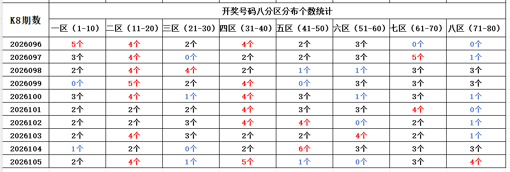首先看上期回顾,“快乐8”第26105期开奖结果:2.6.12.13.14.18.29.31.33.34.35.36.50.67.68.70.71.72.76.77。通过分析开奖号码,分享第一个数据分析:统计开奖号码的八分区冷热走势,判断出号规律。以近10期开奖号码的八分区统计数据为例: