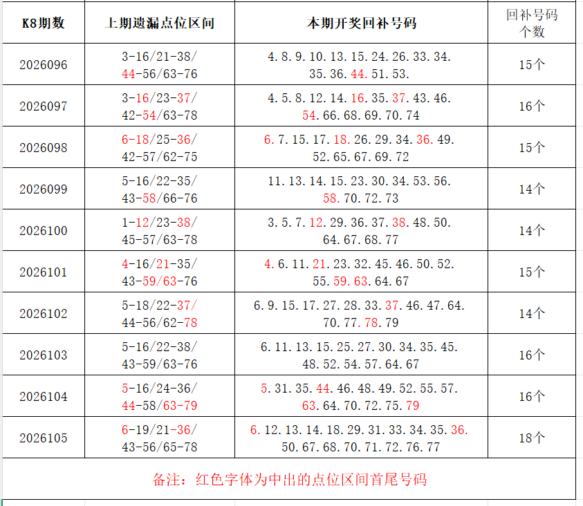 如图,上期的遗漏号码在下期开出10个左右,即为回补号码。定准点位区间首尾号码是关键!以上期2026105期为例,定位4个遗漏区间,围中18码!结合上期开奖号码,以跨度值大于或等于7为依据,本期关注3个遗漏区间:18-29/36-50/50-67;重点关注遗漏区间:3-15/21-32/42-58/66-78。点位区间号码和大底号码请勿混淆,个人分析,仅供参考。