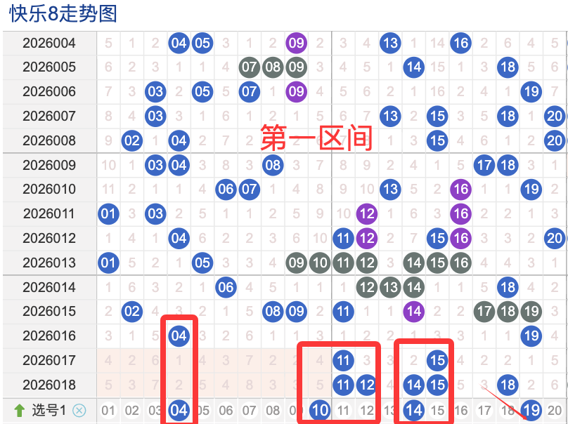 上期一区开5奖号(11.12.14.15.18)上期回顾一区开5个奖号一区间的奖号在上期呈现了递增的趋势,本期先来看号码04具有一定的间歇性,近期比如有时会间隔 3 到5期次出现,整体出现频率较热,号码10活跃度近期较冷。有一定的间歇性,间隔上来说的话不是很稳定的,整体走势有一定的波动性,没有明显的冷热趋势变化,出现的频次近期比较冷.号码14活跃度相还是很稳定,有明显的连续出现态势,偶尔间隔多期会出现一次整体表现热。
