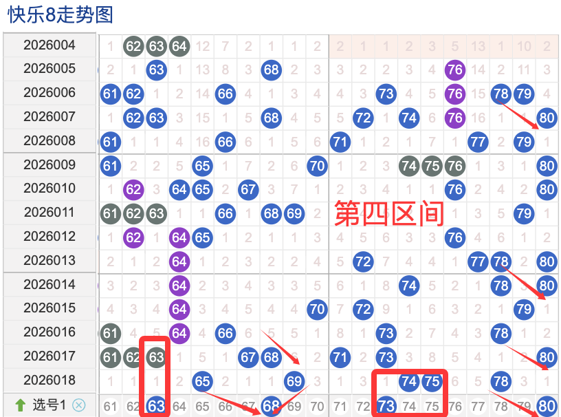 上期四区间开出了5个奖号(65.69.74.75.78)上期的四区开5个奖号呈现了一个递减的趋势,开出的奖号7头回补3个,6头回补2个,先来看号码63在近 30 期内属于还是很稳定的号码,近期出现频率相对也是稳定的,偶尔会间隔多期后出现一次,这个号码要注意防守,号码68具有一定的间歇性活跃度较稳定比如有时会间隔 3到5期就再次出现,也有时会间隔多期,近期整体出现频率比较温热,近期还是要关注的.号码73活跃度近期比较温热,有一定的间歇性。活跃度近期较一般,整体走势有一定的波动性.