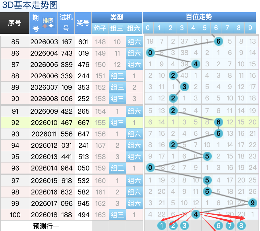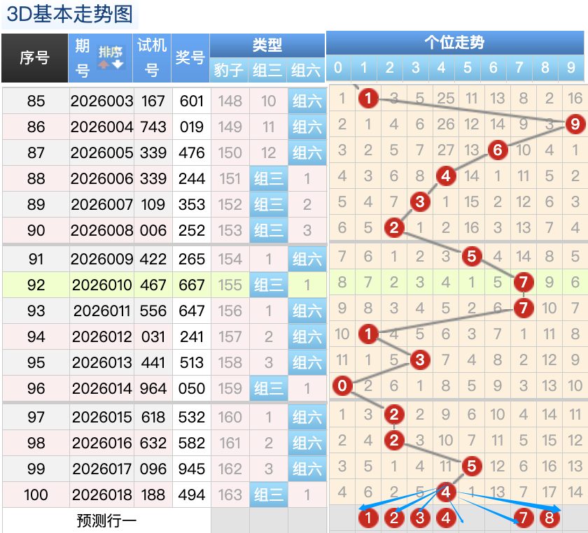 3D上期百位开出的4球,这个奖号是一个冷码的回补落位趋势也是一个比较好的符合百位上的落位点,先来看3号球这里还是有机会继续走出一个顺位的趋势回补号码,还有一个就是2号球和6号球这里的两个小周期号码的落位形态的概率在这里的机会还是很好的要注意防守,然后7号球这里要注意是一个3跨回补落位趋势要注意防守,4号球在百位上要注意可能有机会走重码的落位注意防守 。