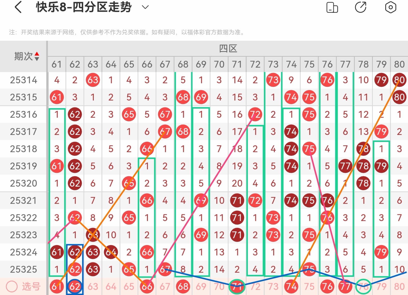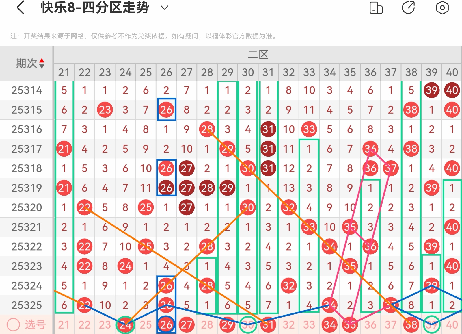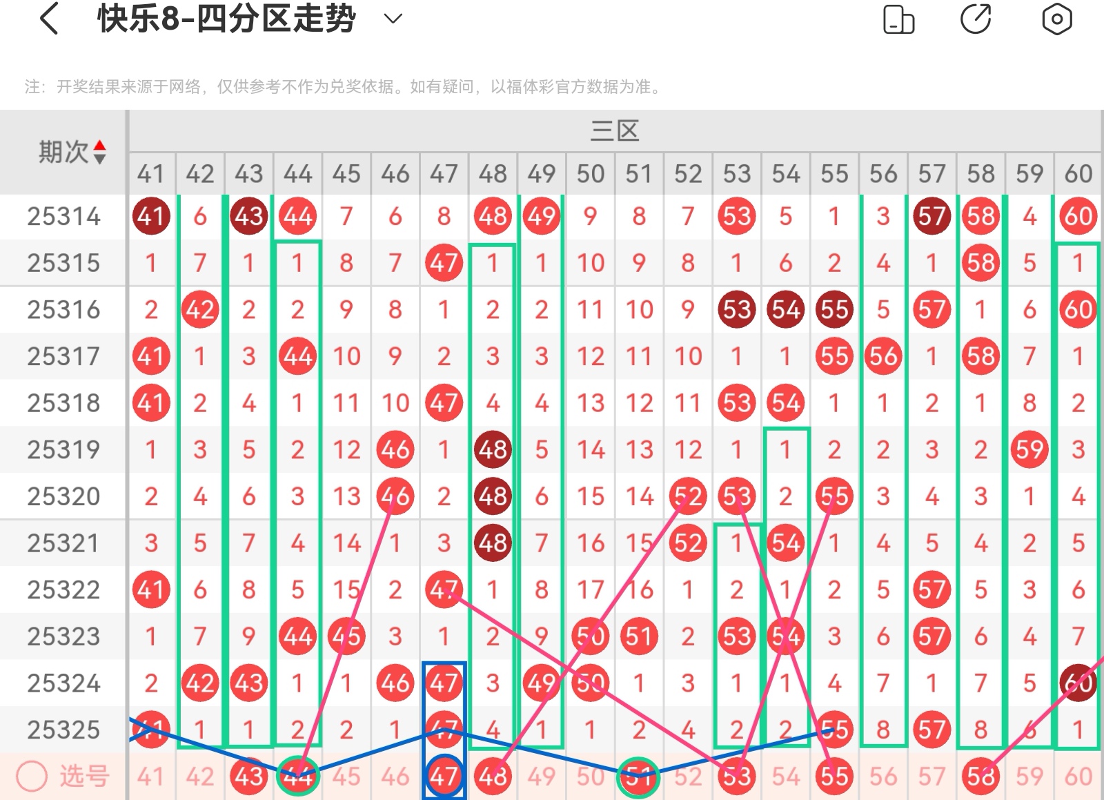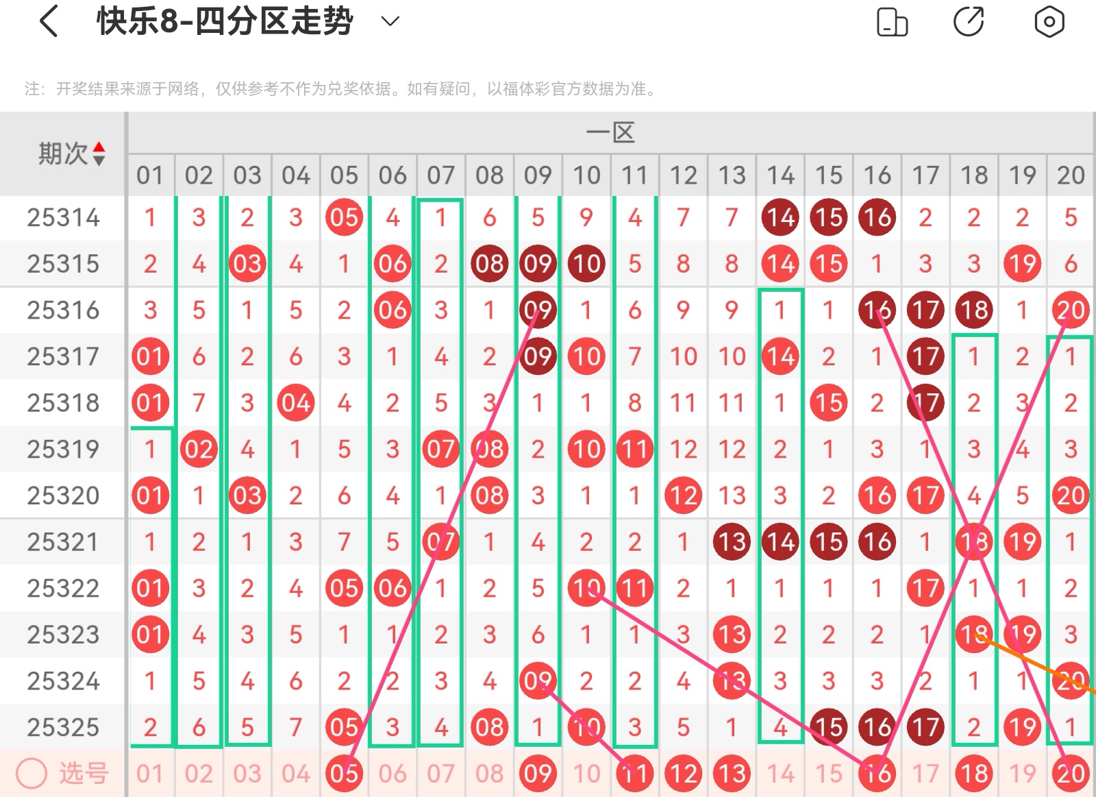 大家好,我是甜丝丝的坏事,主要以快乐八的形态走势、空位走势、遗漏走势以及斜连走势相结合的方法,用公认的四分区走势来进行预测分析,希望能让你有所收获。