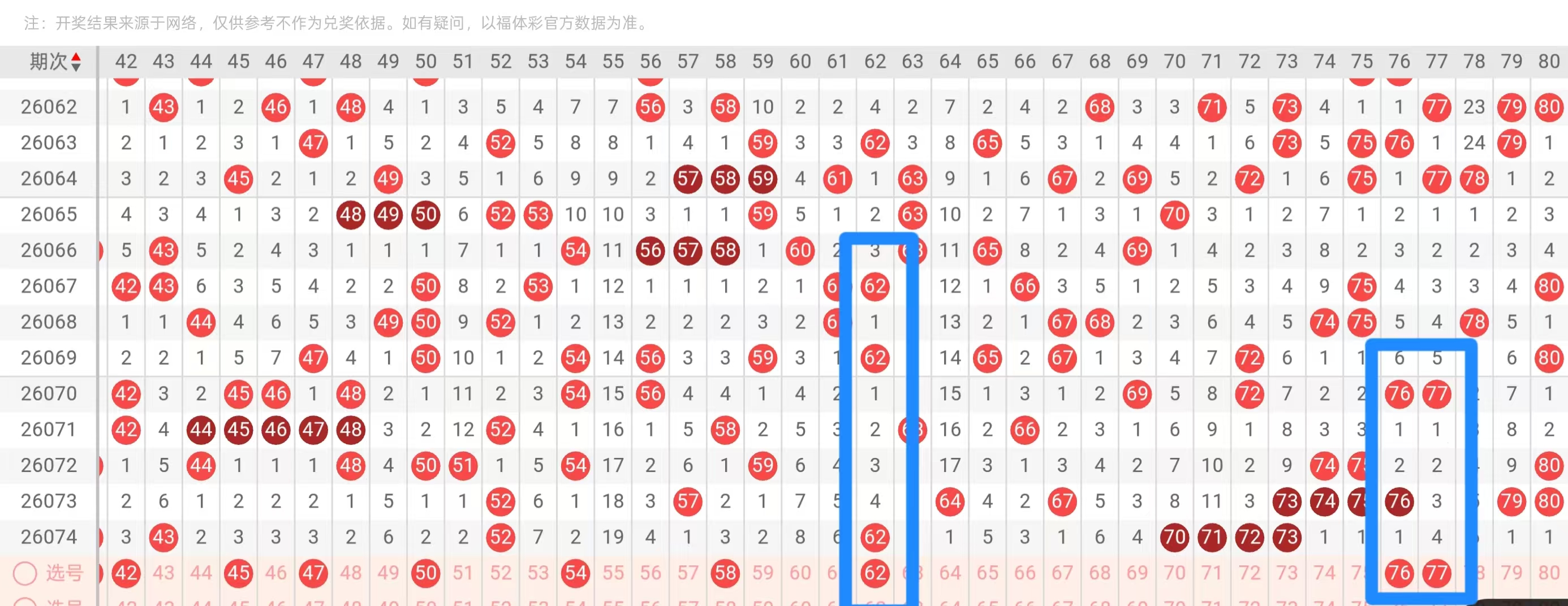 四区61-80:四区近期回暖的趋势比较明显,而且7字头以连号居多为主,那么本期在做的时候,七三以后没有号码,其实最多也就是三码,所以说7字头的涵盖点,我们以76 77,78   3码去在里面挑号码主做,然后62 70百期之内出现过类似的情况,这一类的选项当中的话,中间68,66都还是可以的,只不过大家要去想的一个点就是说7字头这个连号到底会不会开出连号下面在给连号正常来说,这里面是不建议大家去做胆码的,但是本期因为同形态上给过类似的走势所以我们只能说去防守。