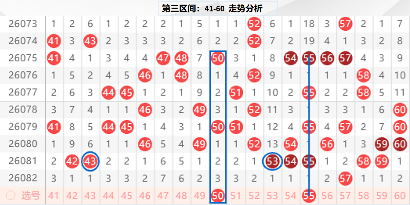 三区分析:【41-60】(走势图标注号码非小黄车大底,请谨慎参考,具体思路将在直播间分享讨论)