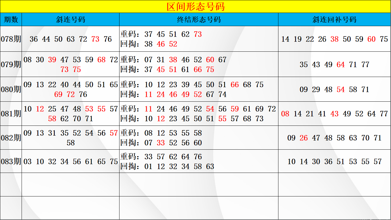 上期四区的开号中在区间的同路组合上继续保持开号重点,且在区间的重码接力周期上继续保持出号重点,空位中也是回补出现了小周期和温冷上的对应。从区间做形态上的判断重点,首先在满形态出号后要特别注意回调的可能,接力周期形态的布局上就是考虑的重点,号码中在重码的形态回补上注意68 69 79 80两码空位连号形态的开号,区间与二区类似都是以双同尾的开号出现,本期在重码的布局上都是要考虑空位形态上的接力出号机会,注意四码中的优先布局选择。同时在双同尾的布局中也要注意分边号码的选择,毕竟在双同尾的开号模式上目前都是分边号码不中断开出,号码中在64 74 69 79四码中注意分边布局上的选择重点。区间在空位中只有两码的小周期,做回补接力上的考虑重点,号码中还是要特别小心71 72中的出号机会,空位周期的开号中是考虑的重点,注意择一的布局选择。
