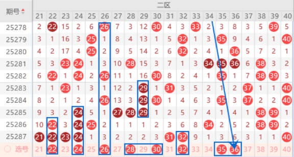 该区间上期开出了21 22 23 24号数字,本期我们注意一下出重号的情况,其中的22 24号数字我们可以重点关注一下。三连号27 28 29号数字已经断号两期了,本期我们注意一下出号情况,其中的28 29号数字我们可以重点关注一下。上期开出了31 32号数字,其中的32号数字我们可以重点关注一下出重号的情况。本期的36号数字是属于三斜连号码,出号机会是有的,我们可以防守一下35 36号数字同出的情况。