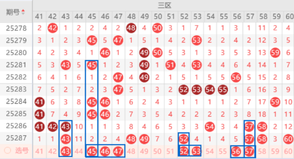 该区间的43号数字我们注意一下出三重号的情况,本期的45号数字是属于空二对称号码,46号数字是属于532走势,都是有机会出号的,我们可以防守西亚43 45号数字或者43 46号数字同出的情况。上期开出了45 49 52号数字,本期也是要注意出一个重号的情况,其中的48 52号数字可以重点关注一下出号情况。本期的53号数字出号机会也是有的,我们可以防守一下。上期开出了57 58号数字的重号,本期不一定会出三重号,我们防守一下就行了。