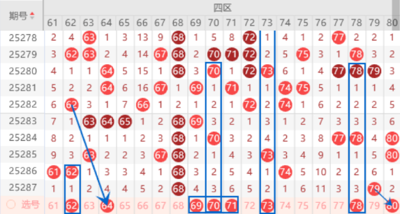 该区间62号数字我们注意一下落号情况,本期的64 65号数字我们也是要注意落下一个号码的情况,本期可以防守一下62 64号数字同出的情况。上期开出了68号数字的五重号,本期我们注意一下走分边的情况,所以本期的67 69号数字我们注意一下出一个号码的情况,本期可以防守一下69 70号数字同出的情况。本期的73号数字是属于242走势,出号机会是有的,我们可以关注一下出号情况。上期出了79号数字,本期我们注意一下走分边的情况,所以本期的78 80号数字我们也是要注意出号情况。