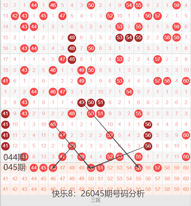 上期该区间开出号码:43 47 49 52 53 55 60,7个号码球,区间呈现热开,区间整体上目前是在热开的周期,号码出号近期也比较平均,分布相对与其他大区间来说很均衡,本期二区间个人预选号码:44 45 46 50 51 55 57 ,44号是遗漏6期的号码,45号是遗漏13期的冷号,46是遗漏间隔1-2-3的状态,三斜连落位走势,50号是遗漏4期的号码,五斜连落位点,51号也是遗漏4期的号码,55号本期看重码的机会,均线三斜连落位点,57号是遗漏7期的号码,通过以上分析,三区间终选号码:44 50 51 55 57 。