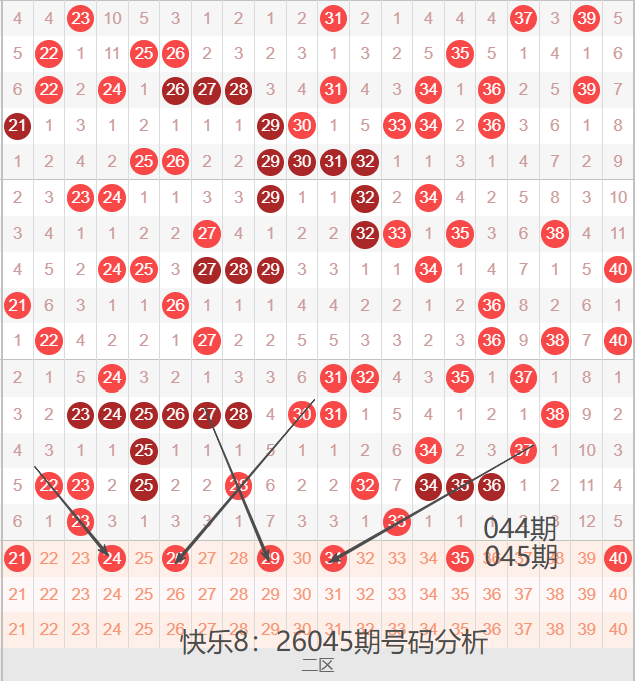 上期该区间开出:23 33,2个号码球,上期区间冷开,二区间目前的状态整体可能要开始走温热状态,近期可以开始多关注区间内空位的回补形式,本期二区间个人预选号码:21 24 26 29 31 35 40,21号是遗漏6期的号码,24号是遗漏3期的状态,三斜连落位走势,26号也是遗漏3期的号码,双线斜连的夹角位置,29号是遗漏7期的号码,均线三斜连落位点,31号是遗漏3期的号码,均线四斜连落位走势,35号是遗漏间隔间隔4-3-2-1的状态,40号是遗漏5期的号码,通过以上分析,二区间终选号码:24 26 31 35 40 。