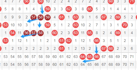 上图是福彩快乐8开奖号码其中一部分,我标注出来的蓝色小箭头表示最近开奖号码的特点,都是隔一期后出现连号这个特点,那么本期可以关注连号64 65 66出号码,因为根据上面标注的蓝色小箭头可以看数字66隔一期后出连号。