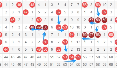 上图是福彩快乐8开奖号码其中一部分,我标注出来的蓝色小箭头表示最近开奖号码的特点,都是隔一期后出现连号这个特点,那么本期可以关注连号53 54 55出号码,因为根据上面标注的蓝色小箭头可以看数字53隔一期后出连号。