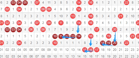 上图是福彩快乐8开奖号码其中一部分,我标注出来的蓝色小箭头表示最近开奖号码的特点,都是隔一期后出现连号这个特点,那么本期可以关注连号15 16 17出号码,因为根据上面标注的蓝色小箭头可以看数字16隔一期后出连号。