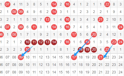 上图是福彩快乐8开奖号码其中一部分,我标注出来的蓝色小箭头表示斜连号码的特点,数字09从数字11一直斜连下来,数字17一直从数字20斜连下来,数字21一直从数字23斜连下来。