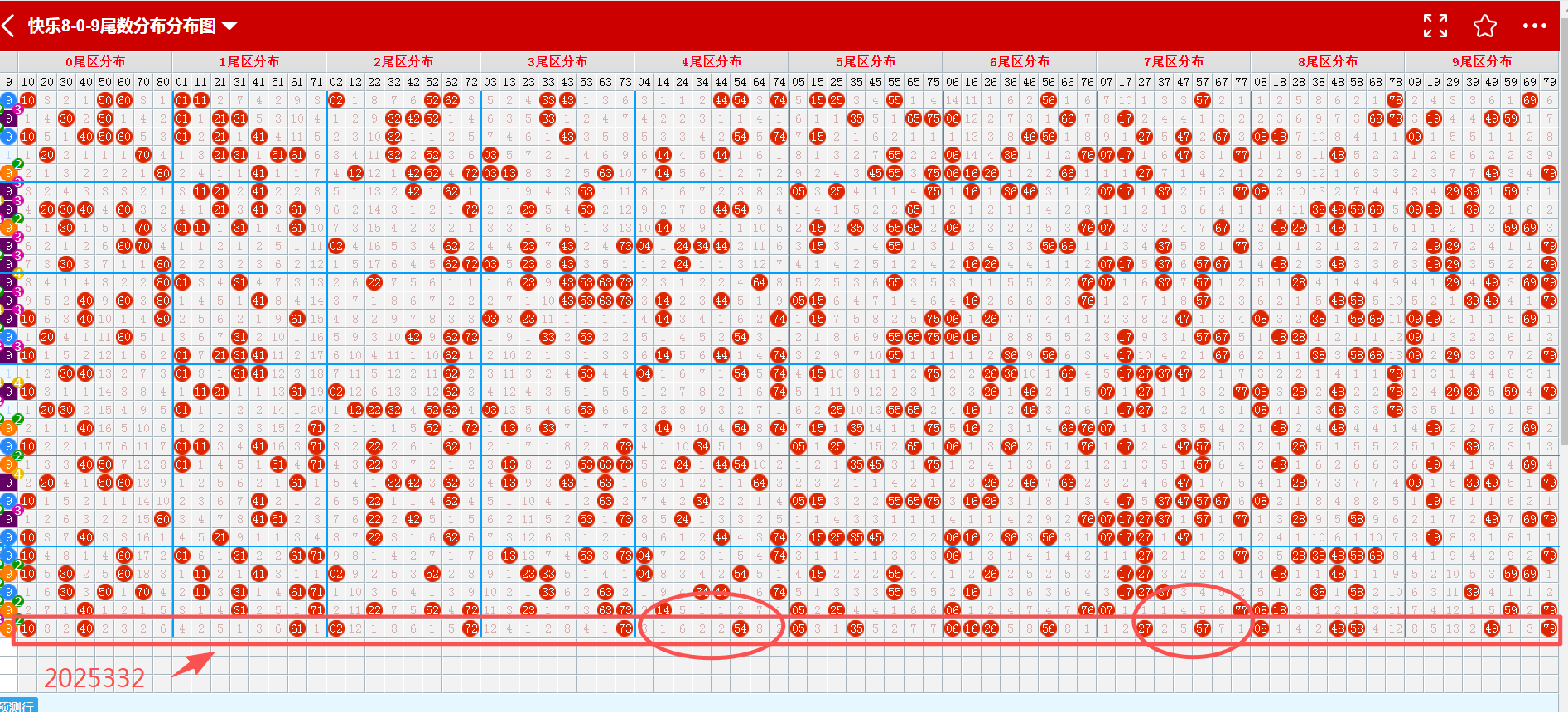 上图是快乐八2025332期的尾码走势图,从图中看0尾到9尾出号个数依次是:0尾号码区开出2个;1尾号码区开出1个;2尾号码区开出2个;3尾号码区开出1个;4尾号码区开出1个;5尾号码区开出2个;6尾号码区开出4个;7尾号码区开出2个;8尾号码区开出3个;9尾号码区开出2个;再看小尾号码(0尾-4尾)区有7码,大尾号码(5尾-9尾)有13码;数据比对统计后可以看到本期6尾出号数量最多,一共开出了4个中奖号码。本期没有出现断区!由走势比对推断2025333期重点需要关注4、7尾区号码下号热度回补和落号数量增加的概率较大。