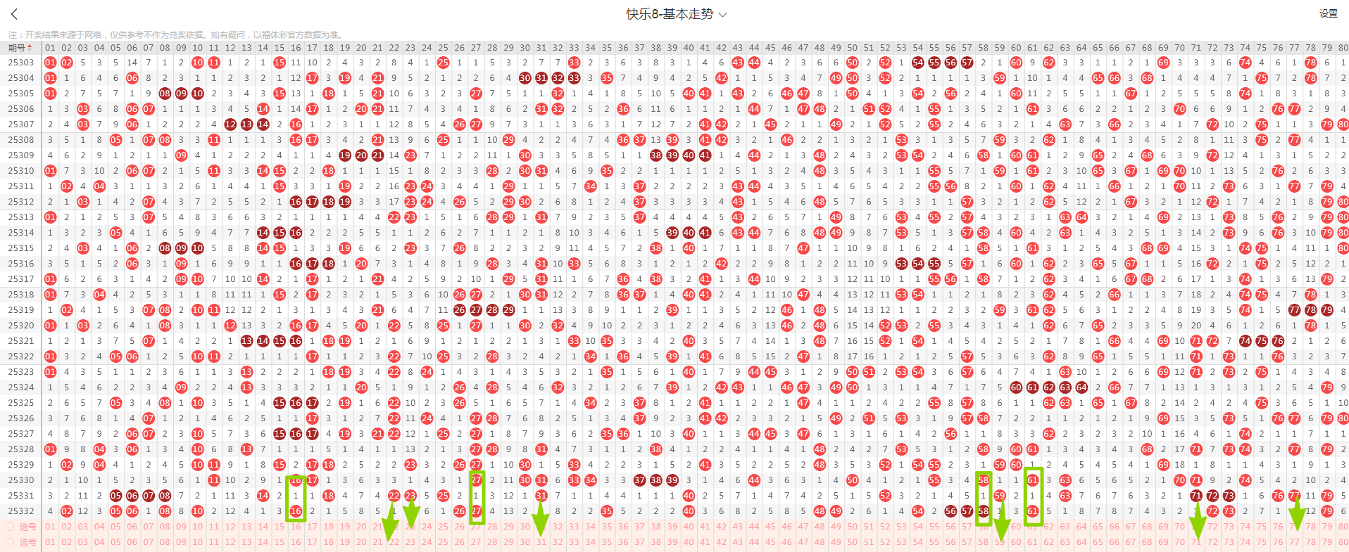 从这张走势图可以看到我画标出来了遗漏示意号码,开出了隔期(遗漏一期的)4个号码(绿色方块标示的),数量与上期一致,从近期走势图看隔期码回温态势形成,本期判断热度回温,落号6个号码概率较大(绿色箭头标示的22、23、31、59、71、77)需要关注,有下号概率;