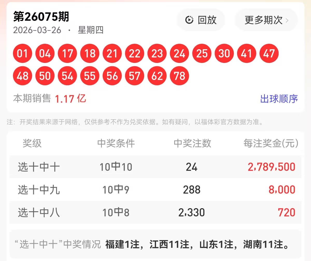 上期福彩快乐8第 2026075期开奖号码为【01 04 17 18 21 22 23 24 25 30 41 47 48 50 54 55 56 57 62 78】,其中大小比10:10,奇偶比为9:11,和值为733,跨度77,四区间比为4:6:8:2。下面是对本期对于每个号码的详细分析。