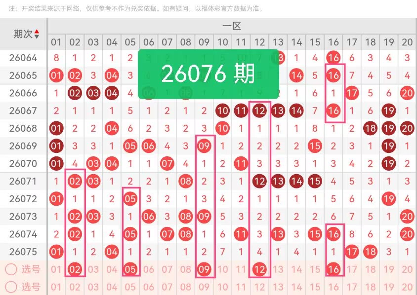 上期第一区间开奖4个号码,本期可能会增加开出。02、05作为区间内的温和走势号码,前期间隔出号规律稳定,近期走势逐步回暖,具备较好的出号潜质;09属于区间内的中位号码,前期多期未集中出号,符合号码轮动的基本规律,补位概率较高;12、16为区间内偶数代表,075期偶数出号偏少,本期加大偶数配比,平衡奇偶分布。