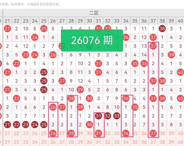 上期第二区间开奖6个号码,本期可能会稳定开出。26、28紧邻上期热号区,属于热区边缘的补位号码,既承接了区间的热度,又避免了重复扎堆,走势连贯性强;31、34为区间内的中位奇数与偶数,前期出号频率稳定,没有大幅偏冷或偏热,属于稳健型号码;37作为区间大号,前期间隔出号规律清晰,近期走势逐步回升,适合作为区间尾端的补位号。