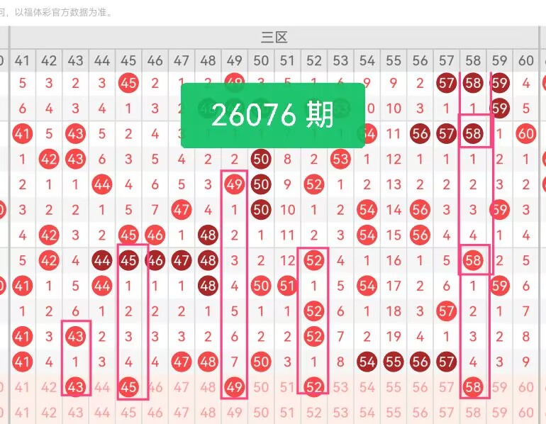 上期第三区间开奖个8号码,本期可能会减少开出。43、45位于区间前端,前期出号节奏平稳,属于温和走势号码,没有出现连续偏冷的情况,适合作为前端补位;49处于区间中位,前期多期间隔出号,符合号码轮动的基本逻辑,近期回暖趋势明显;52、58为区间中后段号码,52衔接上期50号,58填补57号之后的空缺,两者一奇一偶,平衡区间奇偶比例。