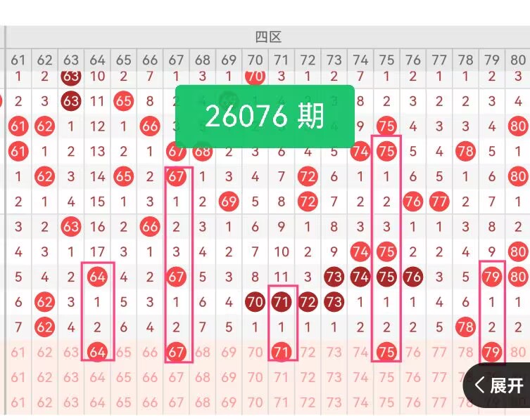 上期第四区间开奖2个号码,本期可能会增加开出。 64、67位于区间前端,前期出号频率适中,没有连续遗漏,属于区间内的稳健号码,适合作为前端启动号;71、75处于区间中段,间隔出号规律清晰,近期走势逐步回暖,弥补上期中段出号空白;79为区间尾号,临近80号,前期走势平稳,作为尾端补位号,能覆盖区间末端区域。
